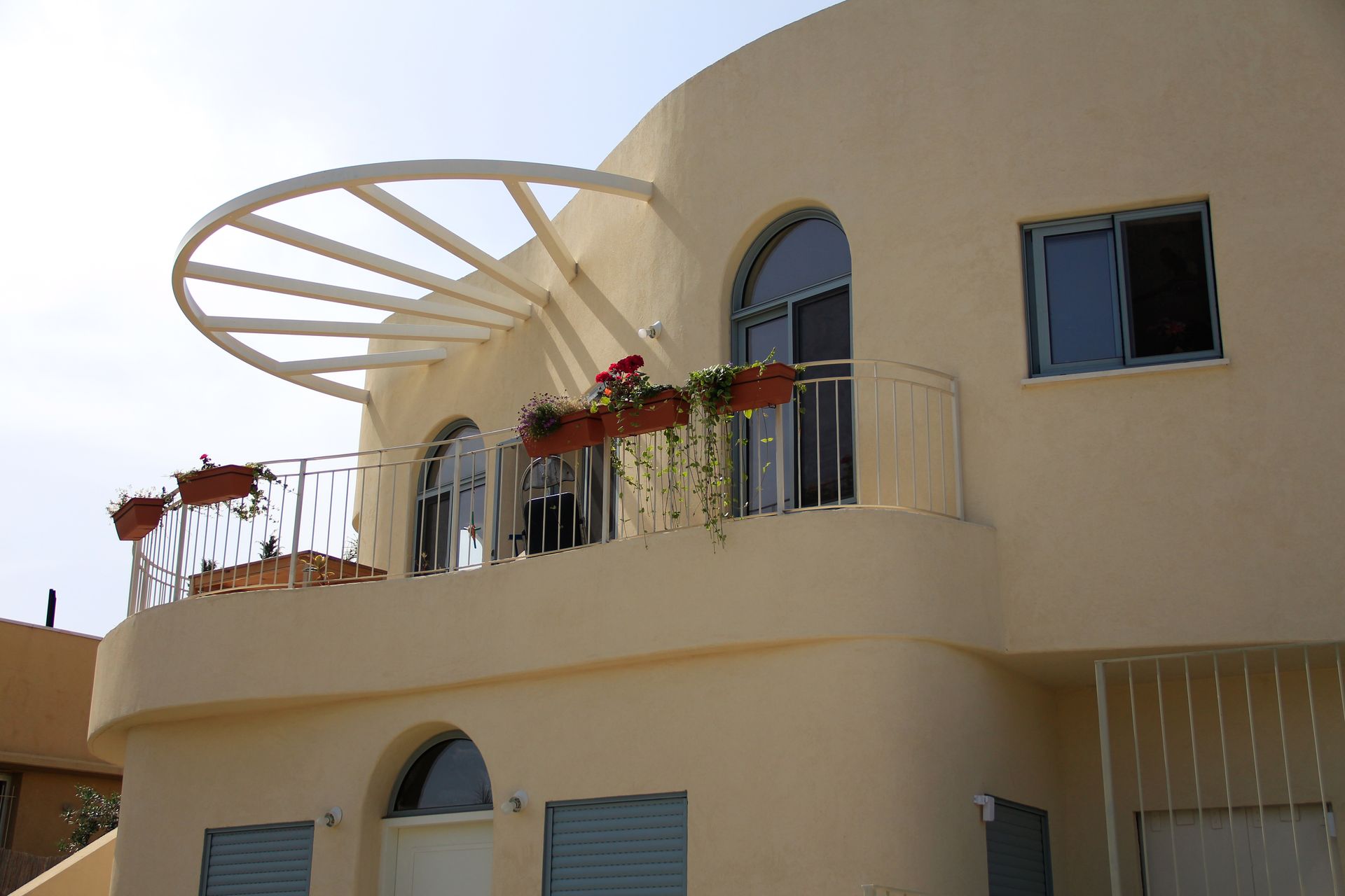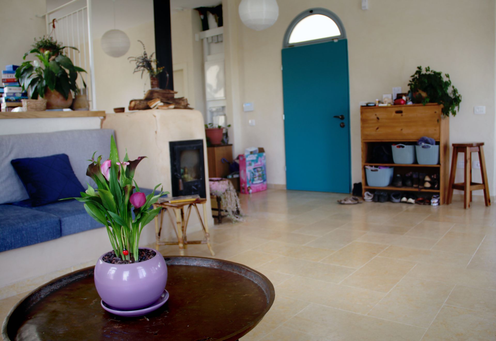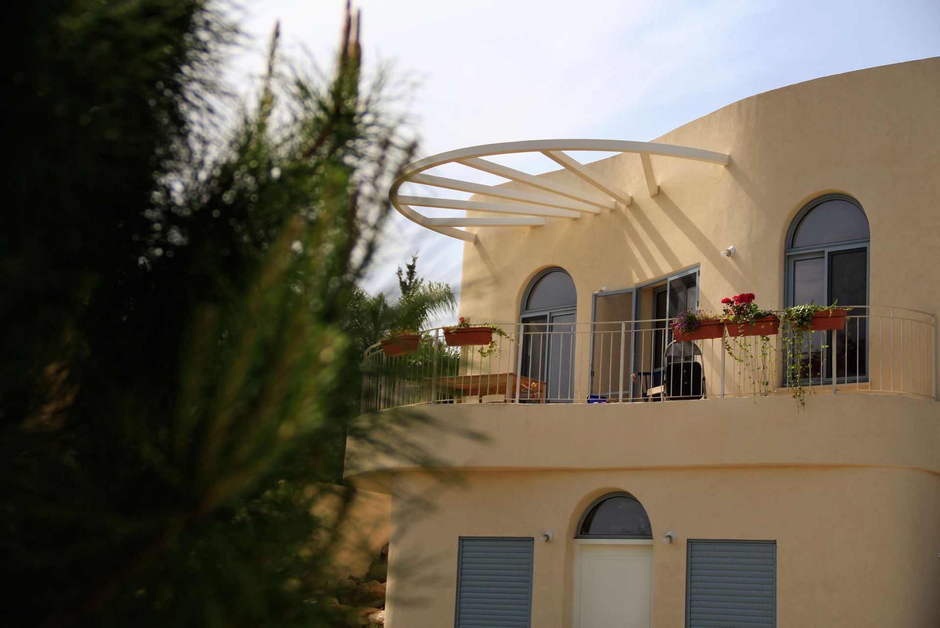 הבית הינו בשני מפלסים משתלב בשיפוע הקרקע ומשלב חדרים בבניה אורטוגונלית וסלון עם חזית של קיו מתעגל המאפשר פתיחה אל הנוף מכמה זויות ומוסיף רכות למרחב החלל המשותף של הסלון.